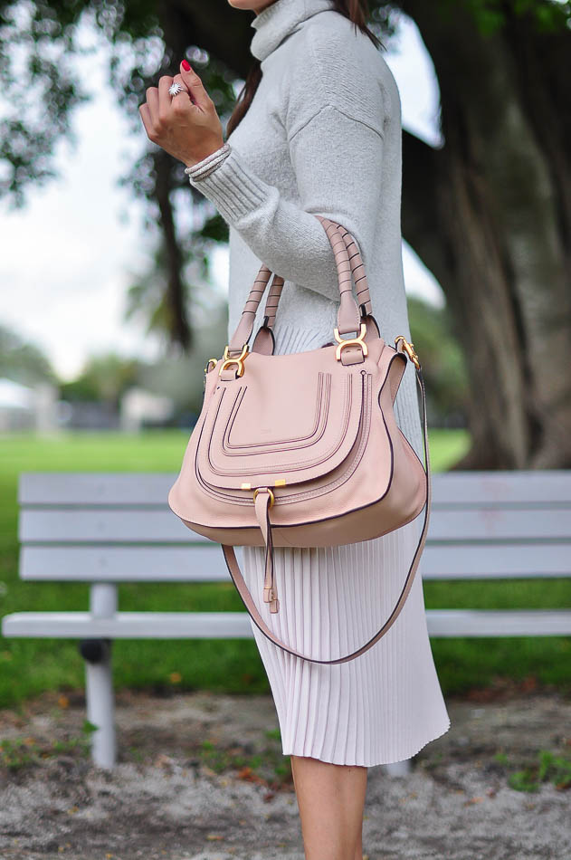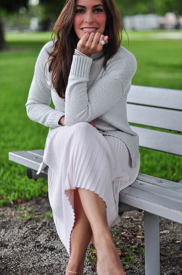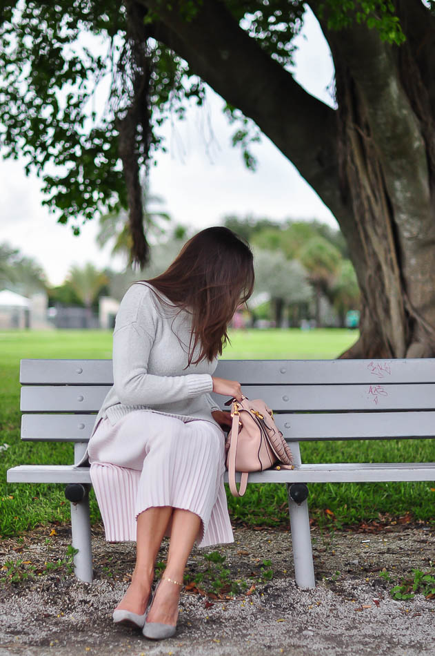I got called for jury duty right before my mom and I took our girls trip to NYC. Luckily, the case was continued and I was only there a few hours. But, they weren’t kidding! The jury room was freezing! I paired my sweater with a beautiful pleated skirt. I’m loving this blush midi skirt right now and this pleated skirt from JCrew is currently on sale (I wore it in a cream color here)!