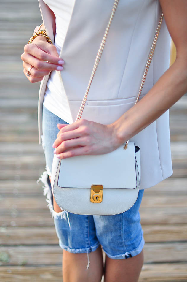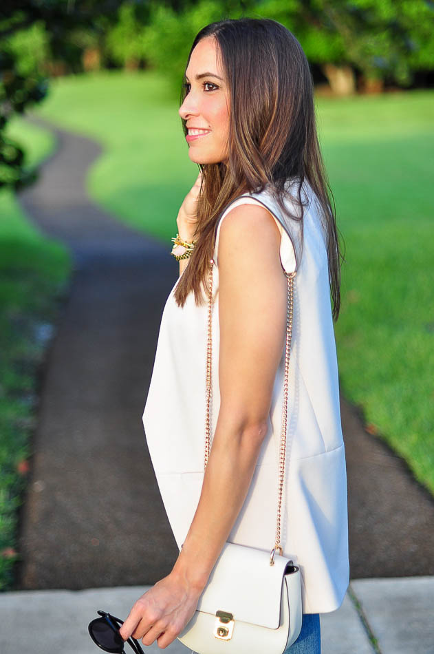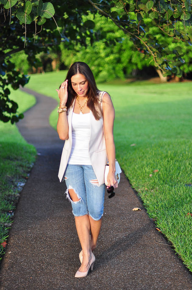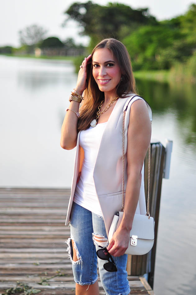 I’m also really loving this new “Holly” long vest by Topshop that comes in blush, olive and black, and this white long vest from H&M. All of them are sleeveless which is perfect for that Summer to Fall transition. In order to maintain the clean lines of the look, I paired mine with a simple white cami and cropped, destroyed jeans. During the winter, I think I’ll pair a light sweater underneath to keep me warm.