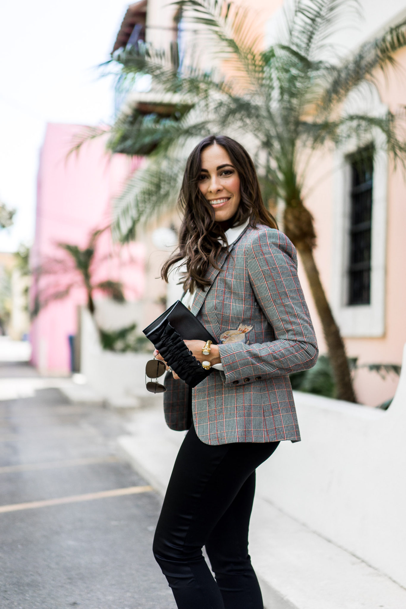 For the office, I’ll normally carry a bigger bag to fit all my items I bring to work. But, to transition to after-hours drinks or dinner grab a clutch with some feminine details. This small ruffled bag can also be worn cross-body like I did here or as a belt bag (so on trend!).