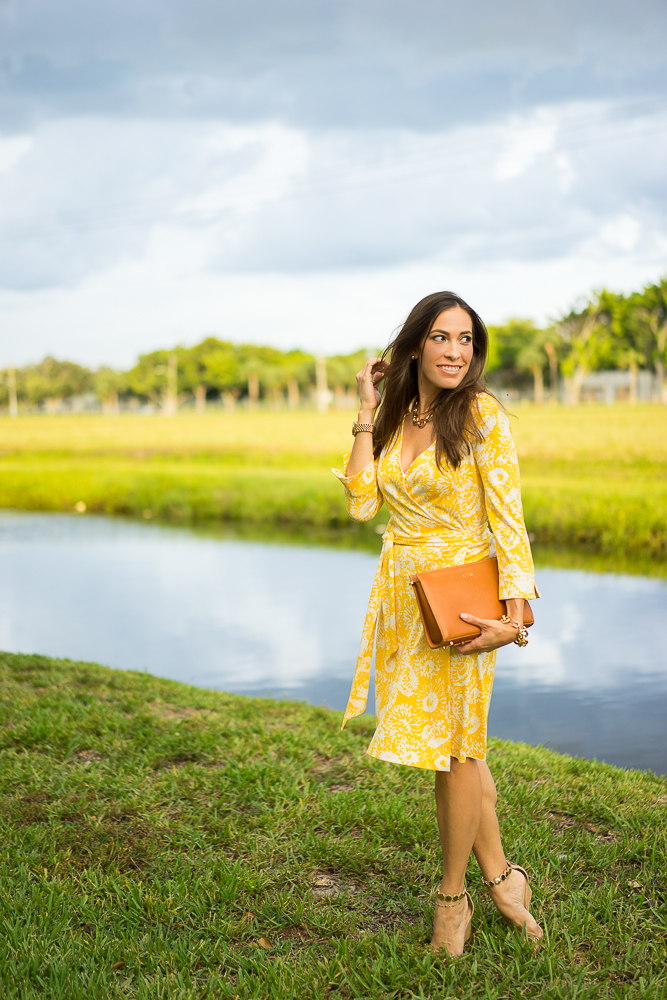 The wrap dress is an iconic style forever synonymous with Diane Von Furstenberg. Truth be told, this pretty yellow DVF wrap dress holds a special place in my heart for more than the fact that it hugs and drapes in all the right places. I was wearing this dress when I first met Matt two years ago. This dress not only kick-started my love for DVF, but it also led me to my future husband! That’s quite a powerful piece of clothing. All jokes aside, a DVF wrap dress makes women confident with it’s secret weapon… subtle sex appeal.
