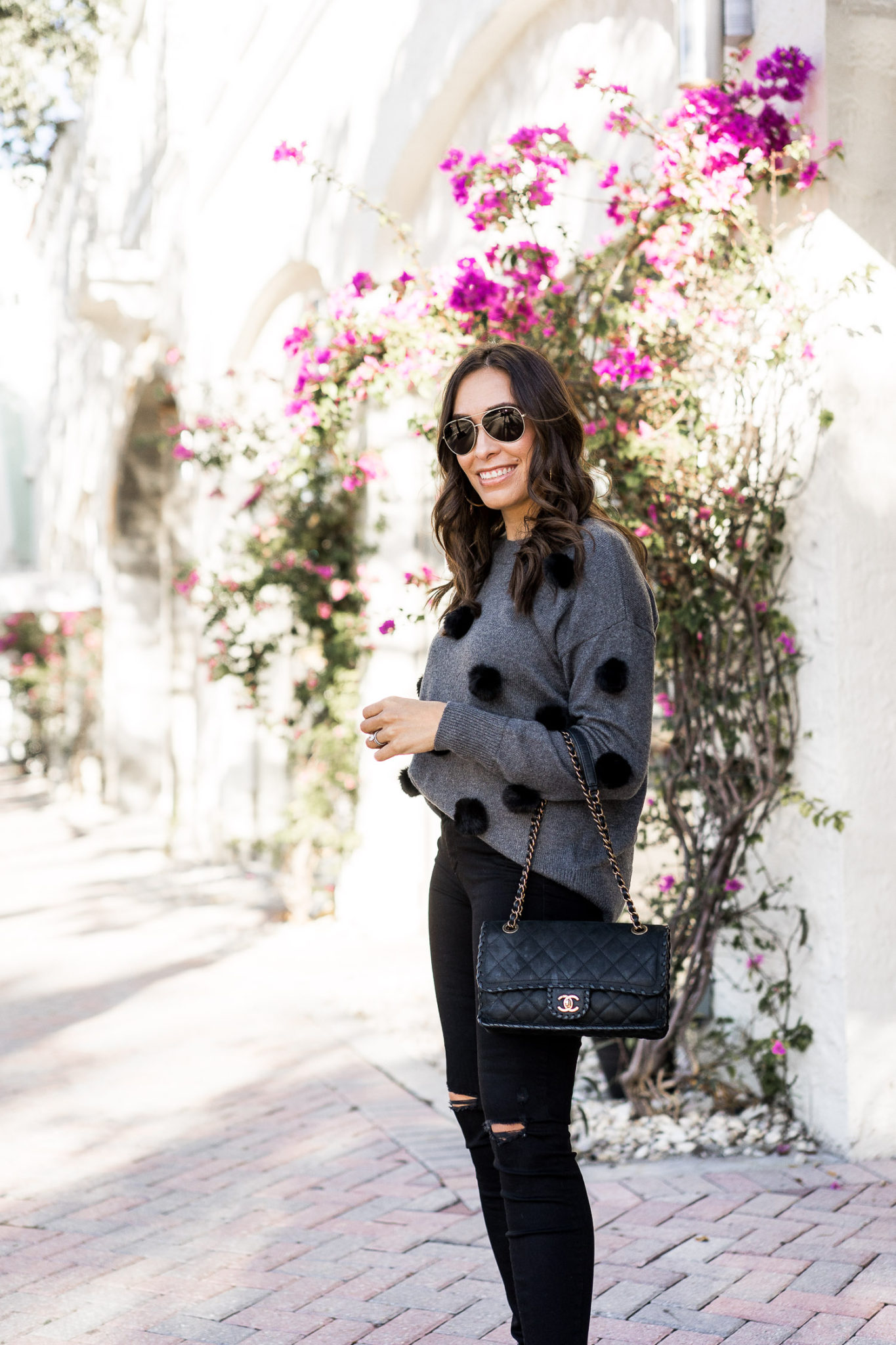 Hey lovelies! Sorry for the hiatus here. With the move and then my birthday and Matt’s birthday, it’s been quite a month. And, things won’t slow down with the holidays fast approaching. We still lack a lot of furniture (namely, living room and dining room). So, we won’t be hosting Thanksgiving or Christmas. But, just being in the new place is pretty exiting. We had some cooler weather in South Florida last week (it’s gone already…) and I got to break out this adorable pom pom sweater. I threw it on with my favorite black distressed denim and my go-to booties (similar here). If only there were more colder days coming our way!