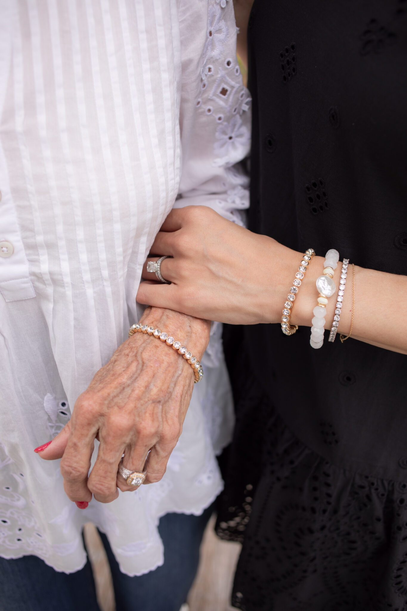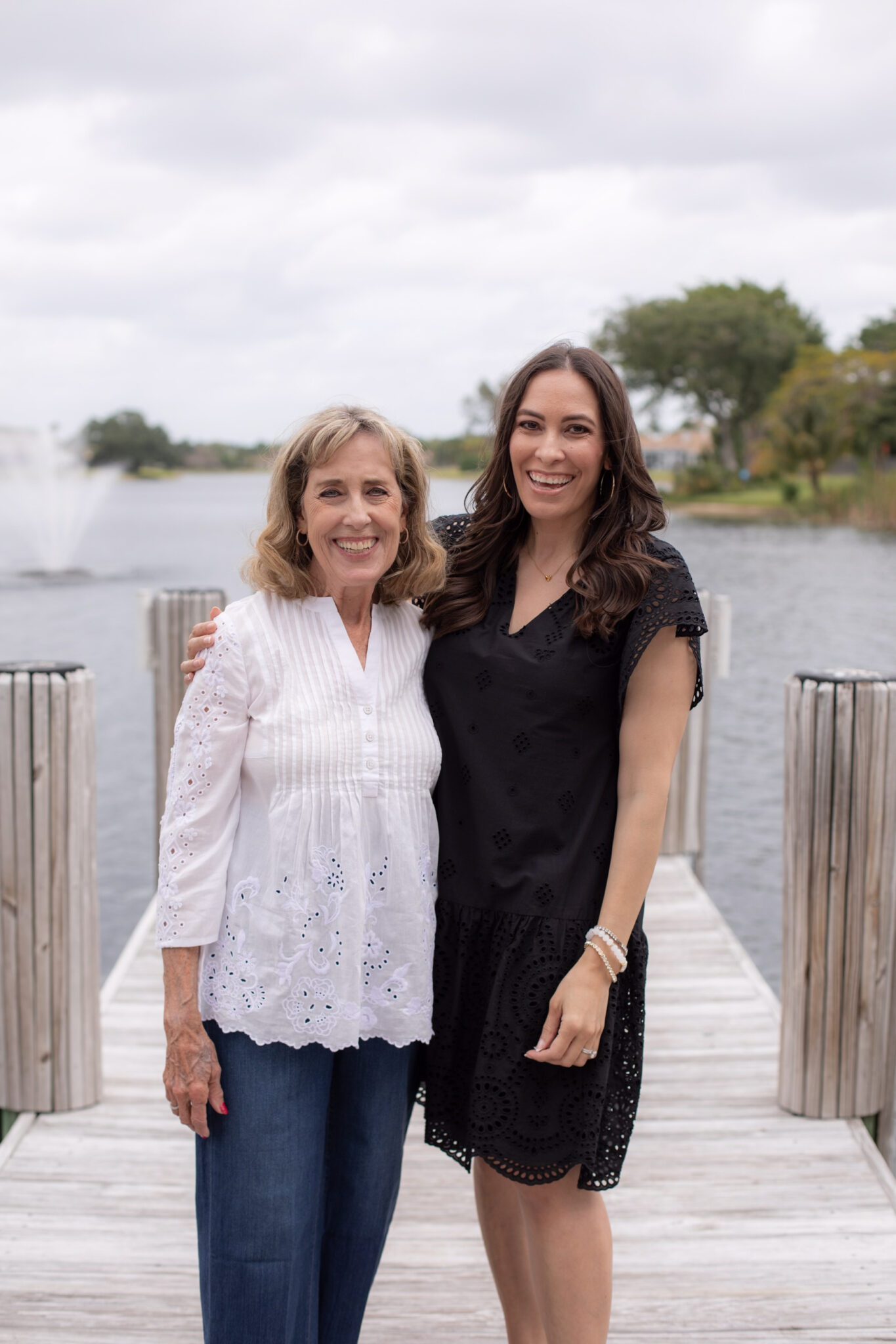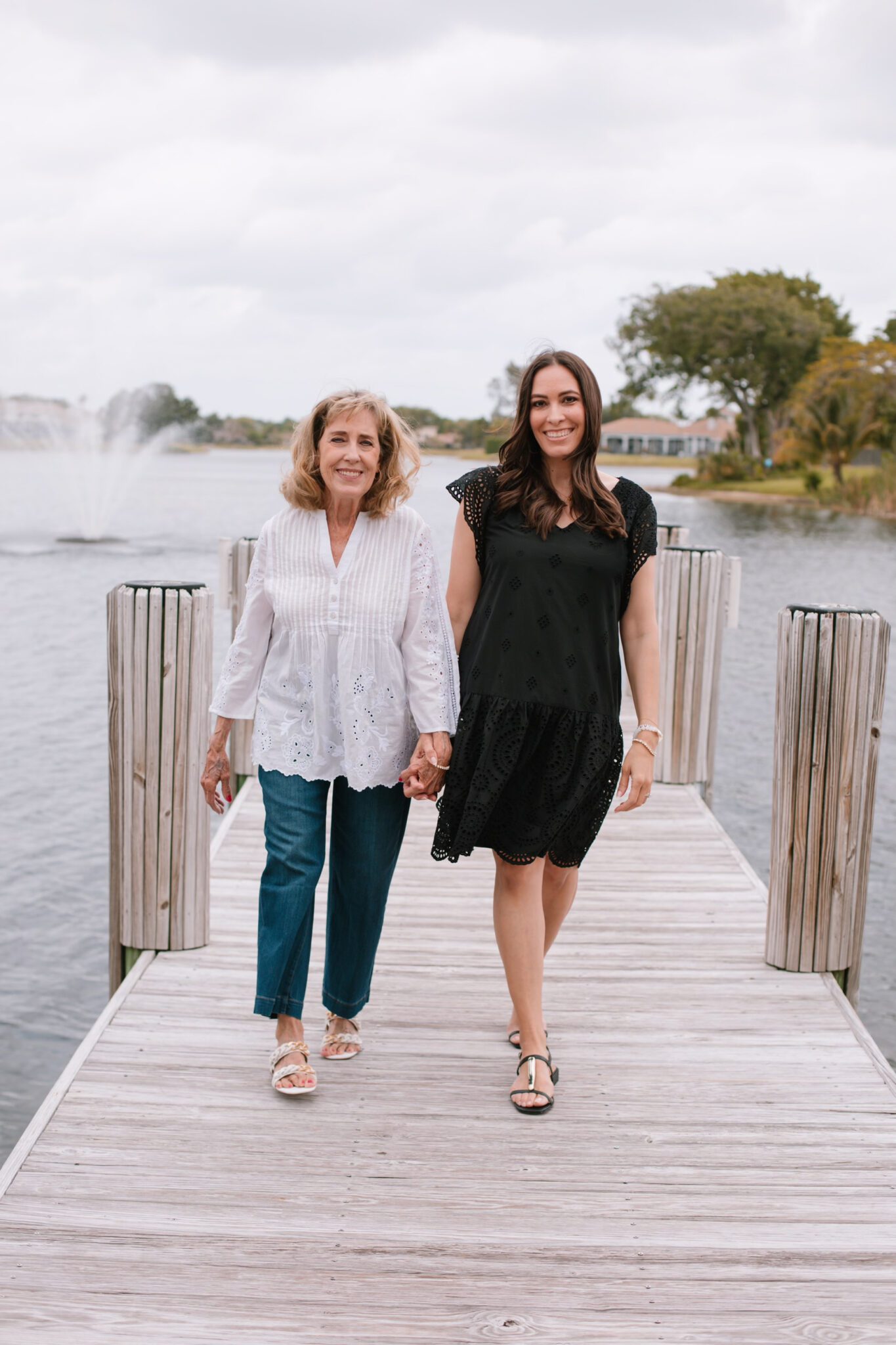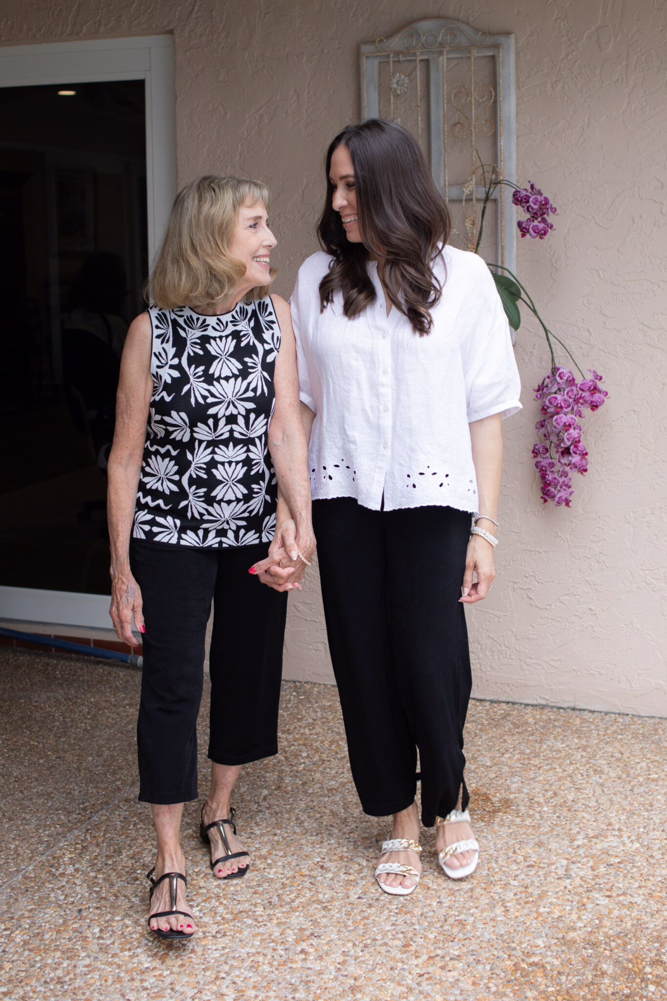 Mom and I love a matchy-matchy moment. So, the black and white pieces in the latest collection at Chico’s are perfect for creating that vibe. She wears a lot of cute tops like this jacquard sleeveless pullover with an easy cardi (she’s always cold!). We’re both obsessed with the Travelers collection. Pants you can pull on, with an elastic waistband that never wrinkle? Yes, please! She completed her look with their new cropped pants. You’ll rarely find her in heels. But, she absolutely loves these chain link sandals (there’s tons of cushion).