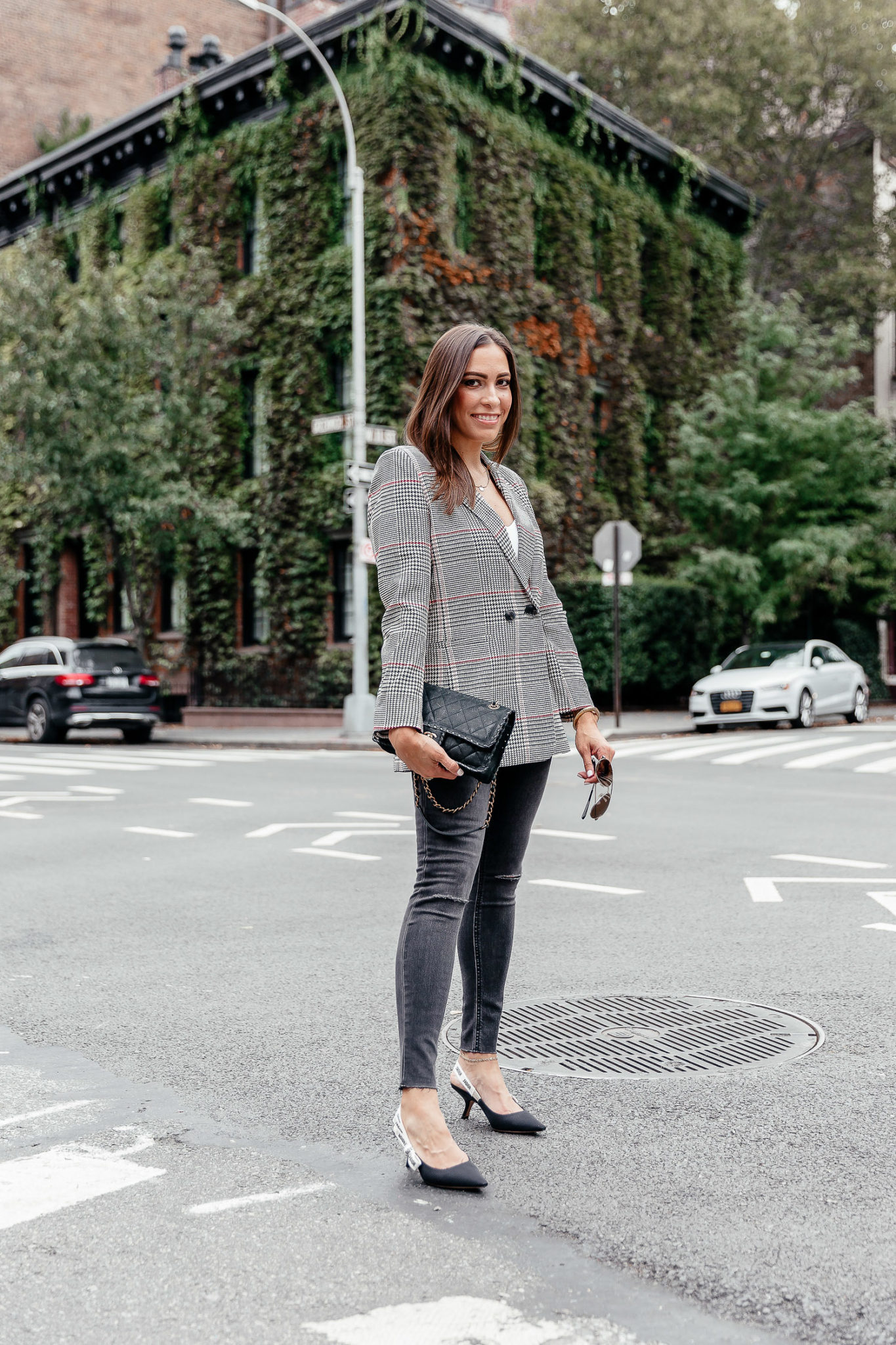 Anine Bing plaid blazerAnine Bing plaid blazer outfit Plaid blazer and jeans outfit NYFW fall fashion trend Chanel bag and Dior slingbacks An easy Fall trend to adopt is the plaid blazer, seen here on South Florida fashion blogger Amanda of Best Luxury Designers Handbags during NYFW with her Dior kitten heels and grey Wrangler denim