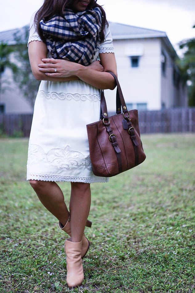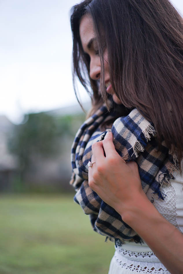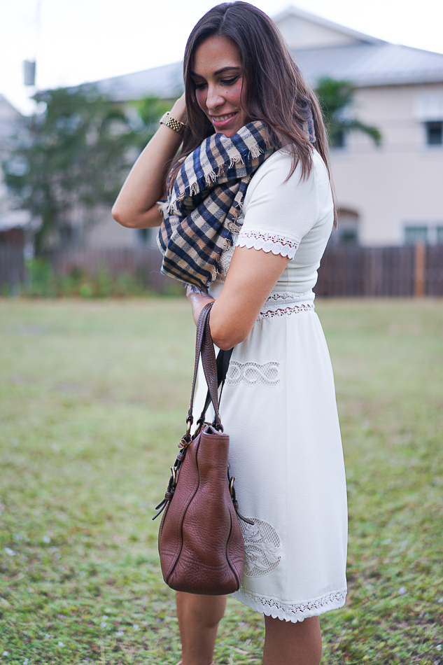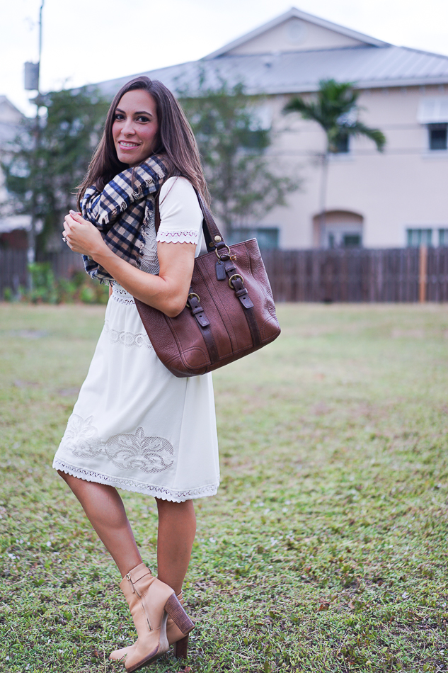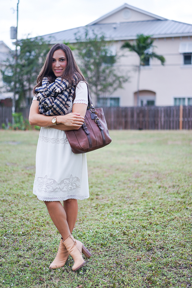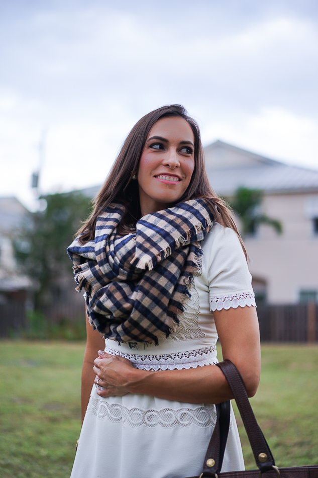 You need a blanket scarf in your life. You just do. It’s one of Fall’s easiest accessories to wear and they are all so cozy! I saw this plaid blanket scarf from The Limited right when I walked in the store and then thought about for a week or two before finally going back to purchase it. It’s now sold out online, but should be available in store for a bit longer (GO. GET. IT.). If it isn’t available, be sure to check for this new version which is also super soft.Amanda wearing white dressThe Limited Luxe blanket scarfPlaid Blanket ScarfPlaid blanket scarfAmanda modeling a white dress, boots and scarf.