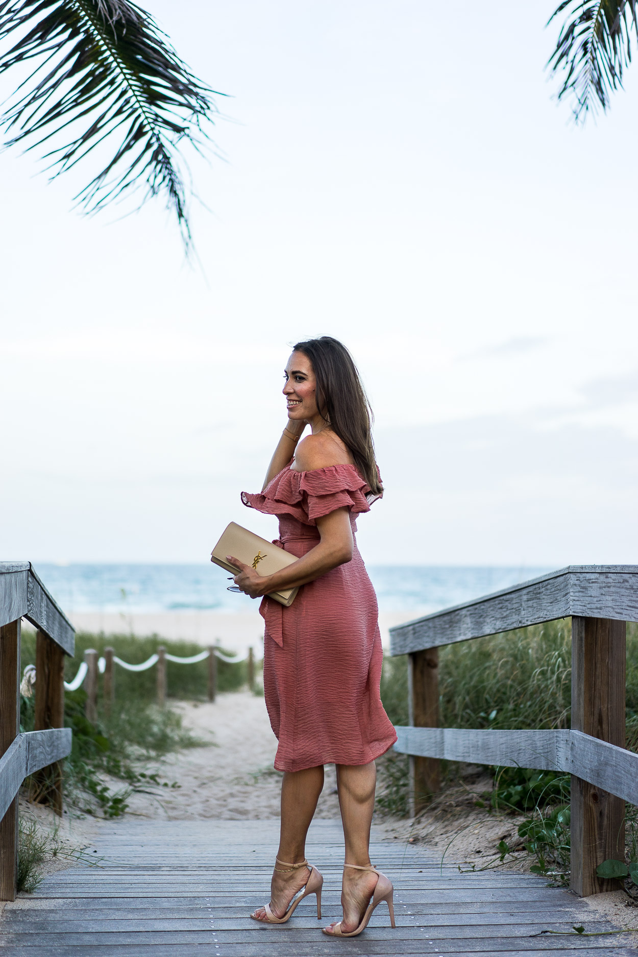 Am I the only one stocking up on everything in this pretty dusty rose color? It’s definitely the color of the season and perfect for Summer style. I’m grabbing everything from dresses to tops and sweatshirts all in this pretty mauve tone that looks amazing with a gorgeous tan. One of the best parts of living in South Florida is the (normally) sunny weather that we have year-round. But, in the Summer the heat picks up even more and I like to show a little skin. This Chicwish dress is perfect for a cute date night outfit. We live in an area where they’re putting a bunch of new retail stores and restaurants right next to the beach. With it’s off-the-shoulder detail and ruffles, I’ll be wearing this out for drinks or dinner at least a few times in the coming weeks.
