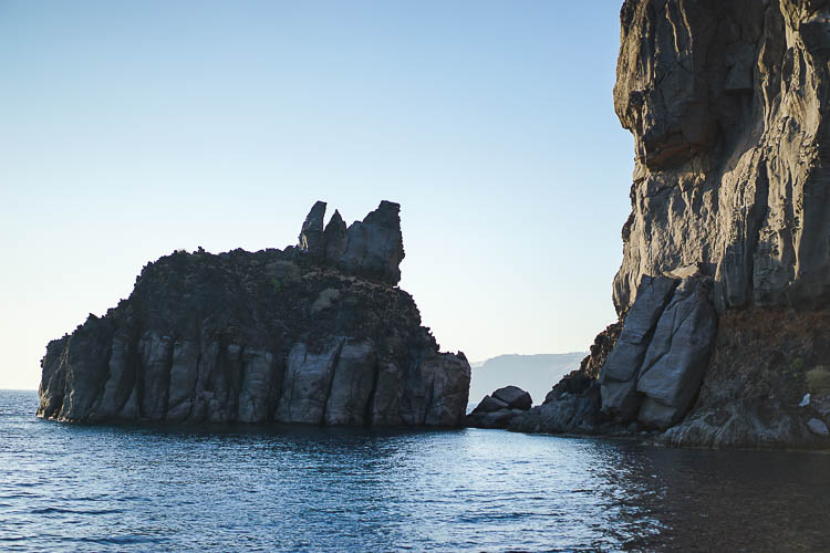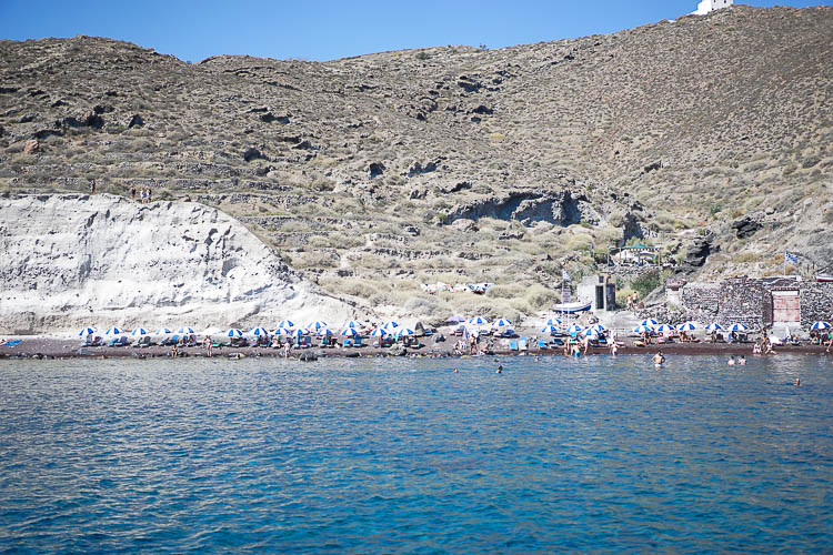 We had such a fun day with the crew at Sunset Oia. The cruise itinerary had several stops, including the red beach (above) and white beach. I really liked the look of the red beach, with its colorful umbrellas and the gorgeous backdrop. The white beach was much smaller than I anticipated. It’s only accessible by boat – or you can swim over from the red beach!
