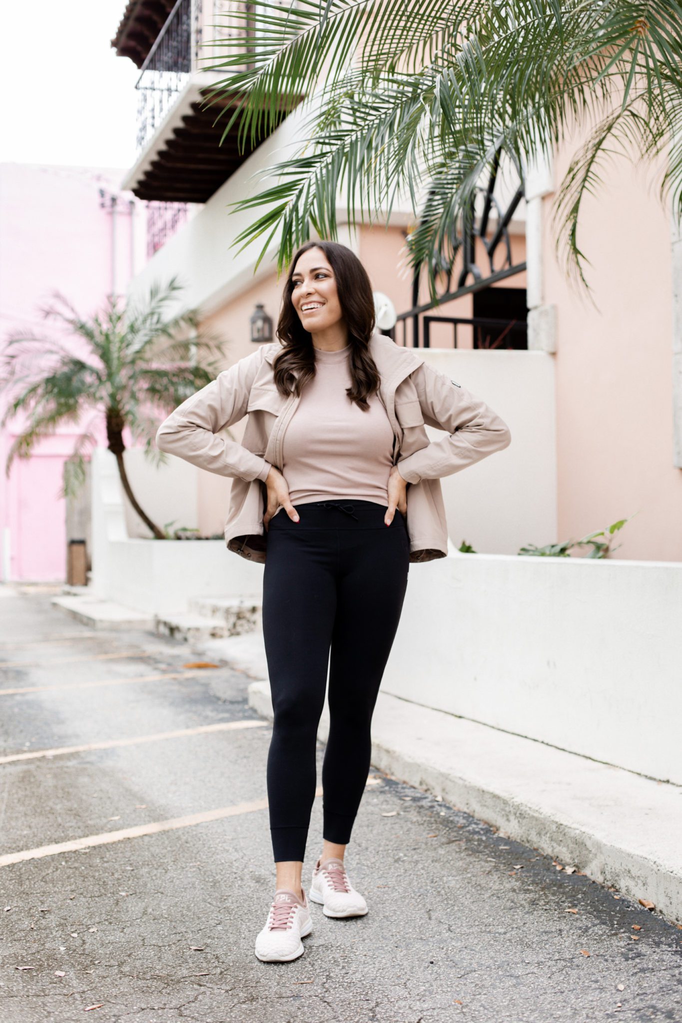 I love to wear this jacket on chilly mornings and after workouts. Two perks are that itās water-resistant and has a hidden hood. But, overall itās just really functional and chic! Iām a huge fan of this piece and wear a medium (TTS).
