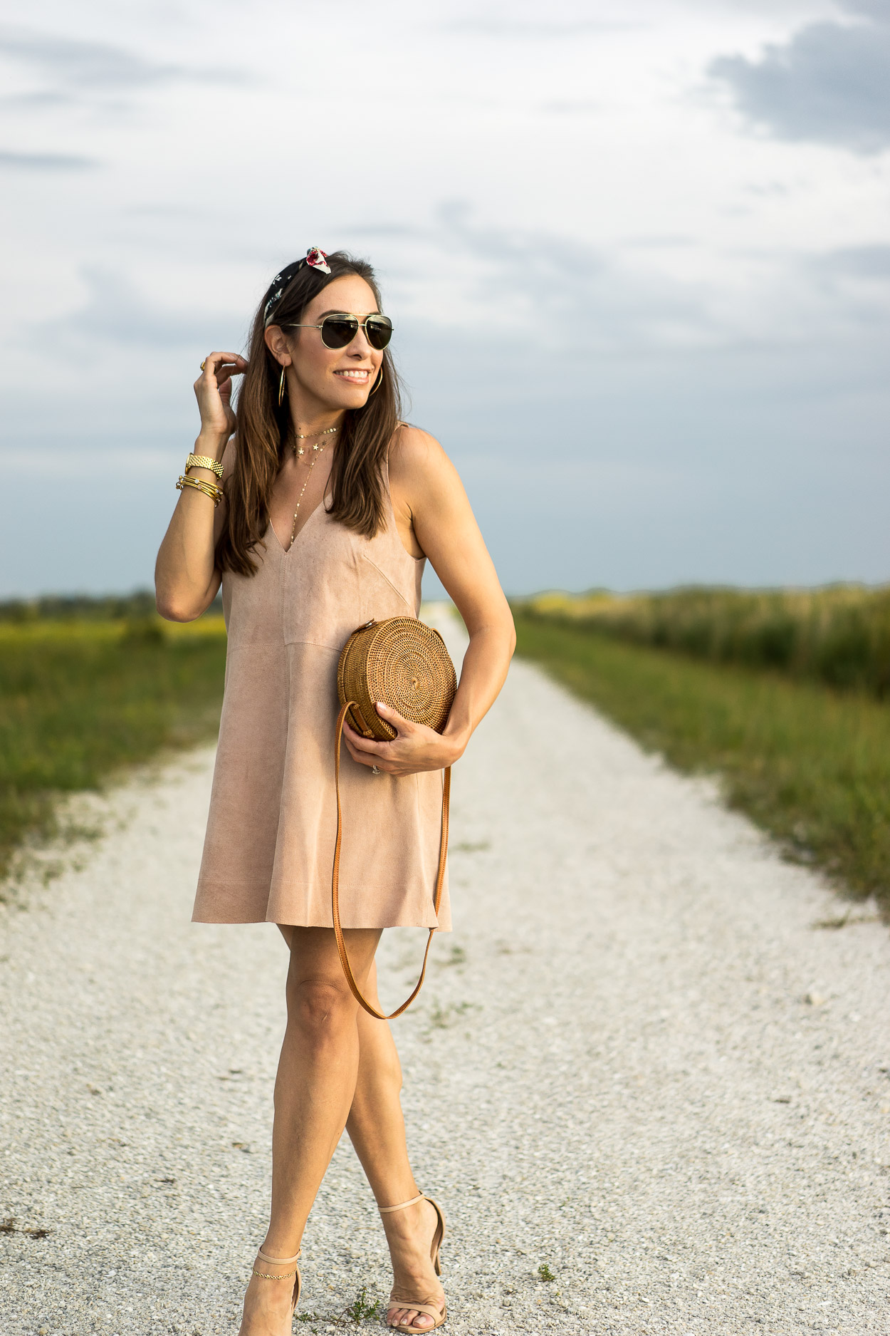 Finally! After a non-stop downpour the last two weeks, it’s not raining in South Florida! We needed it, but it sure made taking pictures to share my Summer style tough (#bloggerprobs). Literally all I’ve been doing after work and on the weekends is staying inside just trying to stay dry. We managed to get out of the house a few times – once to celebrate our first wedding anniversary and another time to see my parents. With the break in the weather, I got out to style this chic suede dress in partnership with Free People for this post (see my first look here) and went for a total boho glam vibe, complete with a floral bandana, layered gold jewelry and retro aviators.