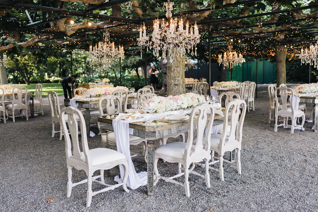 Although our ceremony was romantic, the reception decor felt like a fairy tale! Our string lights in the arbor, as well as some other lighting were by Got Light. But, we selected crystal chandeliers through Lindsey because they were larger and made a greater impact. With our small guest count, we would have needed more of the smaller chandeliers that were available otherwise to make get the same effect.